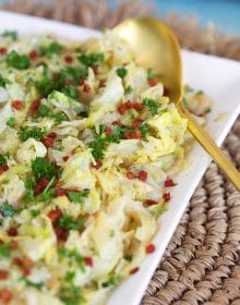 Remove from the heat and serve promptly. Be sure you don’t overcook it because you’ll lose that slight crunch that’s great in cooked cabbage recipes.