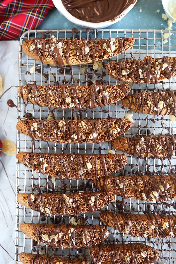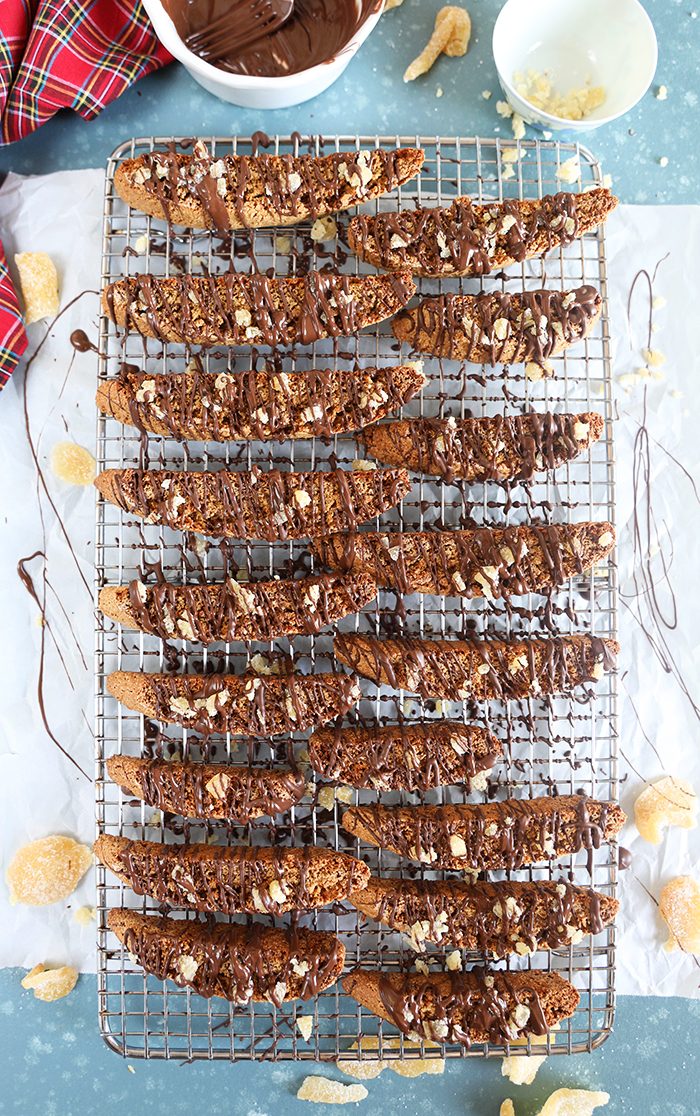 - Cool the biscotti to room temperature and then, using a pastry bag or ziplock bag with the tip cut off, drizzle the melted chocolate all over the biscotti. Immediately sprinkle with the chopped ginger.
