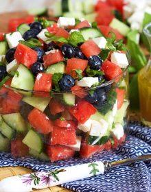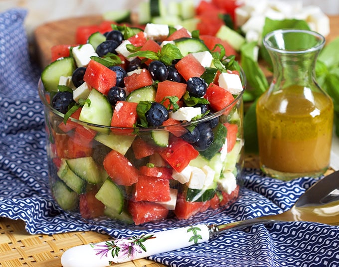 This easy Watermelon Feta Salad is loaded with cucumbers and blueberries for a big bowl of summer flavor you can enjoy all year.